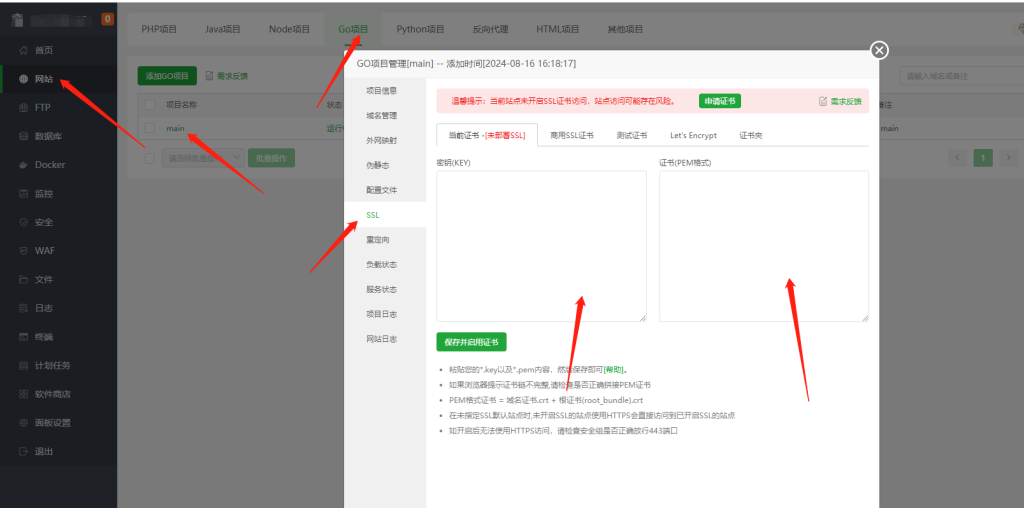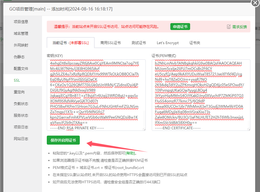 把下载下来的key文件内容和pem文件内容粘贴到对应的框内保存
