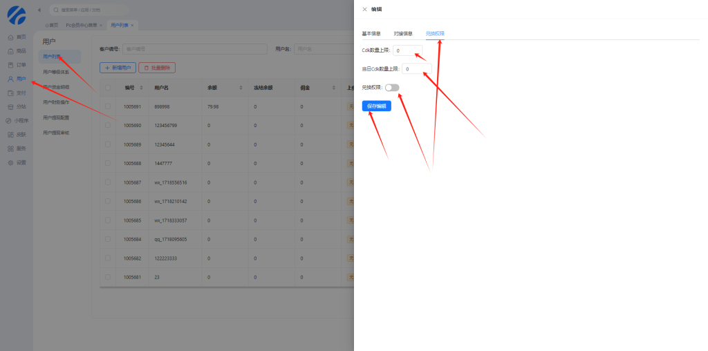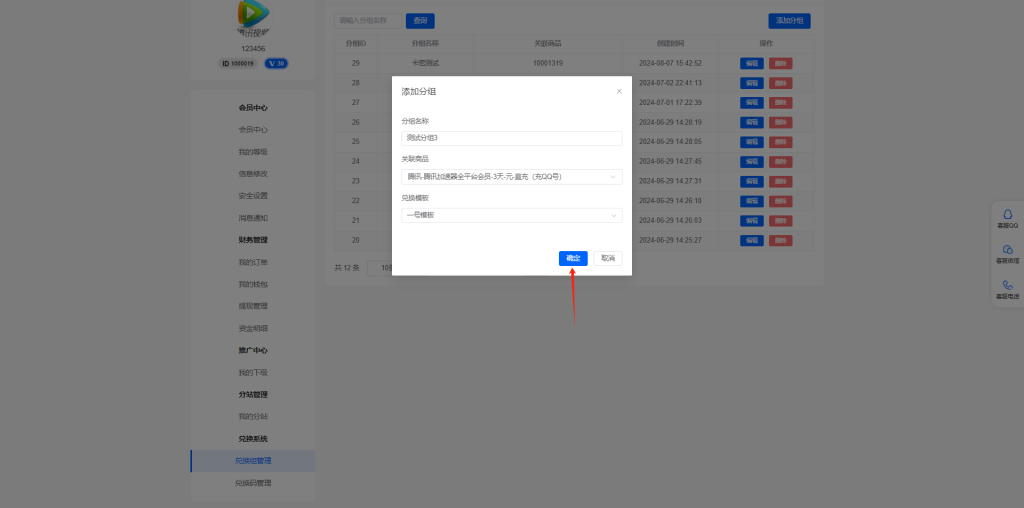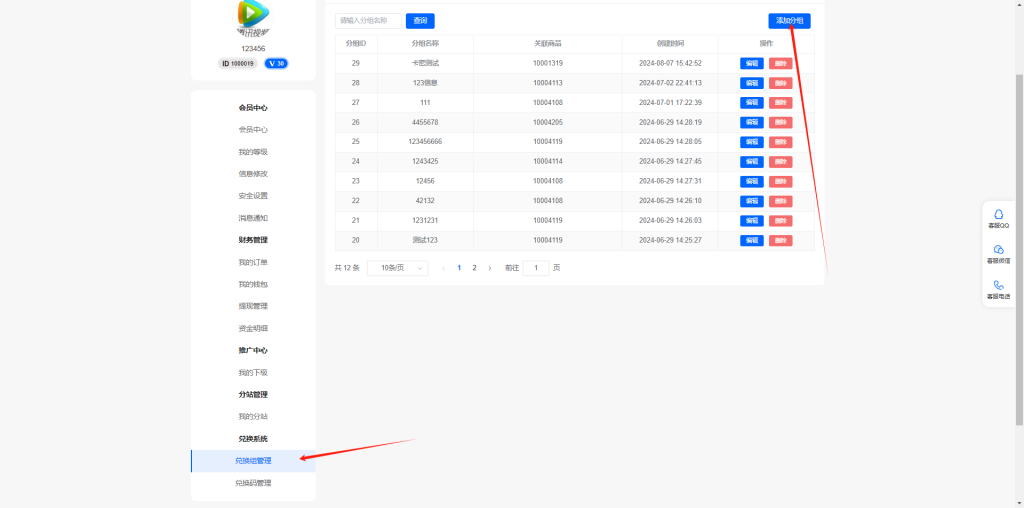 我们使用这个开通了权限的用户账号登录前台,先创建兑换分组
