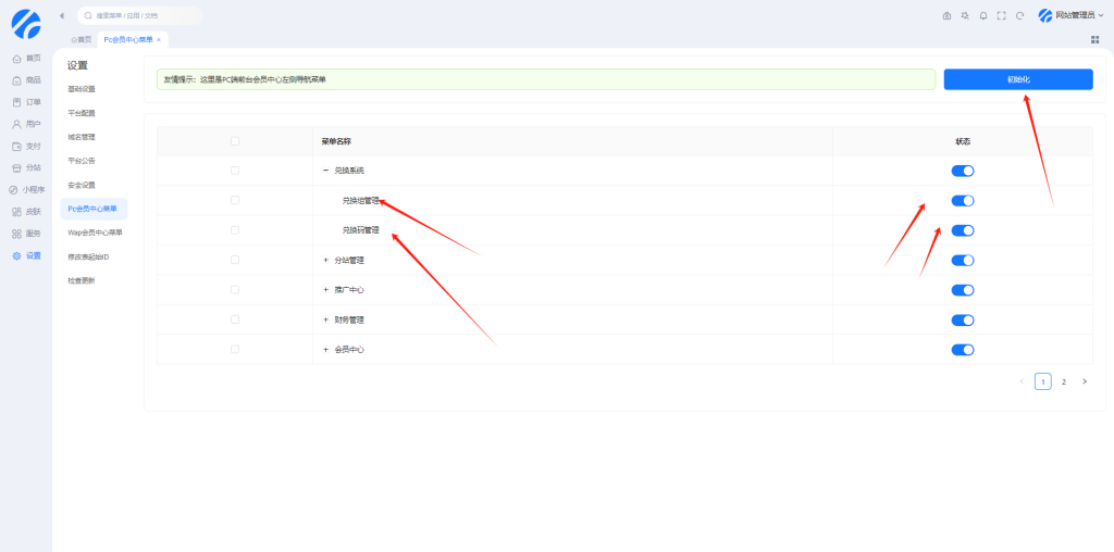 首先保证你的这个菜单是开启的,如果没有就点右上角的初始化我们可以调整用户的每日可生成的兑换码的数量