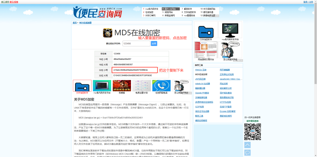 为了安全,我们先进入网站https://md5jiami.bmcx.com/输入我们要重置的新密码,对密码进行加密